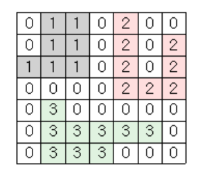 <그림 1>과 같이 정사각형 모양의 지도가 있다. 1은 집이 있는 곳을, 0은 집이 없는 곳을 나타낸다. 철수는 이 지도를 가지고 연결된 집의 모임인 단지를 정의하고, 단지에 번호를 붙이려 한다. 여