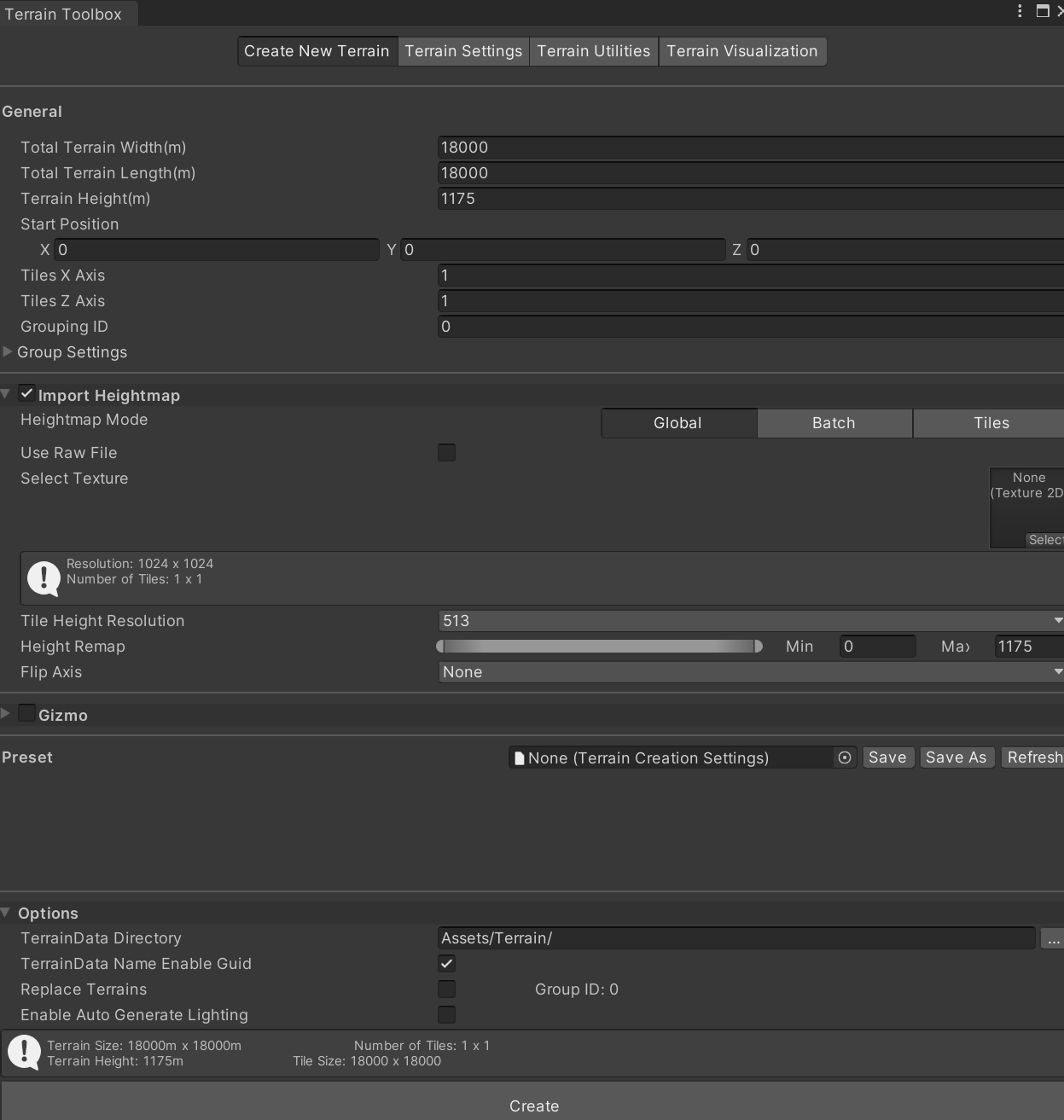 제가 설정한 Terrain의 크기는 18k를 기준으로 하였습니다 그리고 최대 높이는 1175로 지정해 주며,