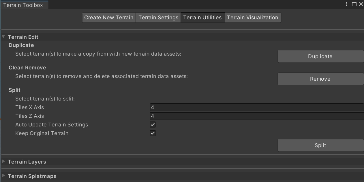 terrain toolbox 의 Terrain Utilities칸을 보게 되면, Split 부분이 있습니다.