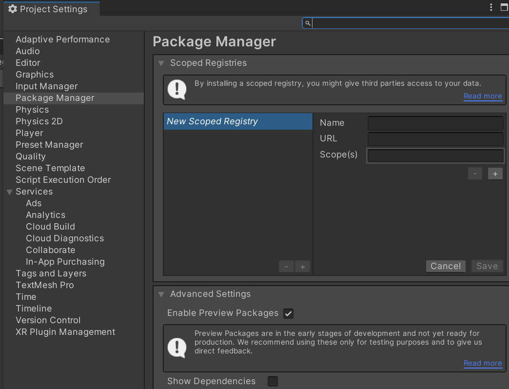 Project Settings 의 Package Manager 구문의 Enable Preview Pacakges가 체크 되어야지 볼 수 있습니다.