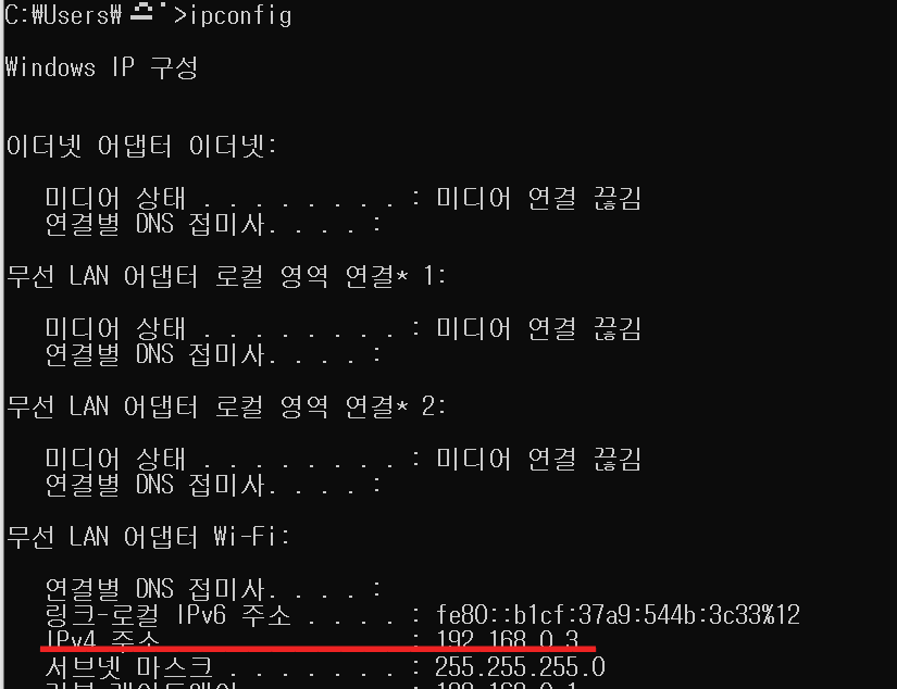 💻 Programming (프로그래밍)/ETC (공인) 외부 아이피 , 내부 아이피 찾는 법 (외부 IP , 공인 IP, 내부 IP) - 외부(공인) 아이피 1. 네이버에 "내 아이피" 검색 2. ip.pe.kr 외부 사이트 들어가기 https://ip.pe.kr/ 내 아이피 확인 (My ip address) - ip.pe.kr 220.64.102.254 당신의 공인 아이피 주소는 위와 같습니다. 접속하신 국가는 대한민국 (KR) 입니다. 자세히 알아보기 서버를 이전 했습니다! NEW --> ip.pe.kr 내부(사설) 아이피 1. 윈도우 유저 Win + S 키를 동시에 누른 뒤 cmd(명령프롬프트) 실행 cmd 창에 ipconfig 키보드로 타자를 친 후 엔터 IPv4 주소가 내 내부 IP입니다 주로 192.168.0.1~ 192.168.0.9 사이의 숫자 일 것입니다. 2. 맥북 유저 " System Preferences > Network " 에서 확인이 가능합니다 공유하기 게시글 관리 천리길도 한걸음씩 저작자표시 변경금지 (새창열림) '💻 Programming (프로그래밍) > ETC' 카테고리의 다른 글 [Docker] 입문 코드 정리 (0) 2022.12.02 Web 용어 개념 잡기 (0) 2022.11.23 Base 64 이란? (0) 2022.05.04 이미지 라벨링 - labelImg (0) 2022.04.28 Anaconda 가상환경 설정 (2) 2022.04.28 Contents 당신이 좋아할만한 콘텐츠 [Docker] 입문 코드 정리 2022.12.02 Web 용어 개념 잡기 2022.11.23 Base 64 이란? 2022.05.04 이미지 라벨링 - labelImg 2022.04.28 댓글 0 + 이전 댓글 더보기