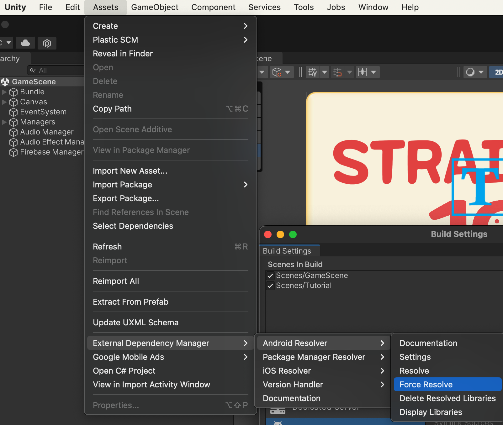 💻 Programming (프로그래밍)/Unity | C# [Unity] Gradle failed to fetch dependencies, Android Resolve 오류 - 가끔씩 Android Resolve가 제대로 안되면서 오류가 생기더라구요. 이때 한참 고생했는데 제가 해결한 방법을 알려드리겠습니다. 1. Preference - Exteranl Tools의 밑 JDK, Android SDK, NDK 경로가 제대로 되어있는지 확인합니다. 2. Project Setting - Player - Publishing Settings칸 여기에서 * Custom Main Gradle Template * Custom Gradle Properties Template 둘다 모두 체크를 해주시면 됩니다. 3. 1,2를 하신 이후 Assets- External Dependency Manager - Android Resolver - Force Resolve 인 Force Resolve를 하였을때, 밑의 사진처럼 Android Dependencies Resolution Succeeded가 나온다면 성공입니다! 공유하기 게시글 관리 천리길도 한걸음씩 저작자표시 (새창열림) '💻 Programming (프로그래밍) > Unity | C#' 카테고리의 다른 글 [Unity] 스크립터블 오브젝트(Scriptable Object)로 데이터 저장, 읽기를 손쉽게! (0) 2023.09.15 [Unity] Asset - Layer AI 생성한 이미지를 내 게임에 사용하자~ (0) 2023.09.13 [Unity] CloudOnce(클라우드온스)를 이용하여 icloud 에 게임데이터 저장하기 (0) 2023.01.26 [C#] get set 프로퍼티 (0) 2023.01.25 [Unity] 프로파일링 + 최적화 습관 (1) 2022.10.20 Contents 당신이 좋아할만한 콘텐츠 [Unity] 스크립터블 오브젝트(Scriptable Object)로 데이터 저장, 읽기를 손쉽게! 2023.09.15 [Unity] Asset - Layer AI 생성한 이미지를 내 게임에 사용하자~ 2023.09.13 [Unity] CloudOnce(클라우드온스)를 이용하여 icloud 에 게임데이터 저장하기 2023.01.26 [C#] get set 프로퍼티 2023.01.25 댓글 0 + 이전 댓글 더보기
