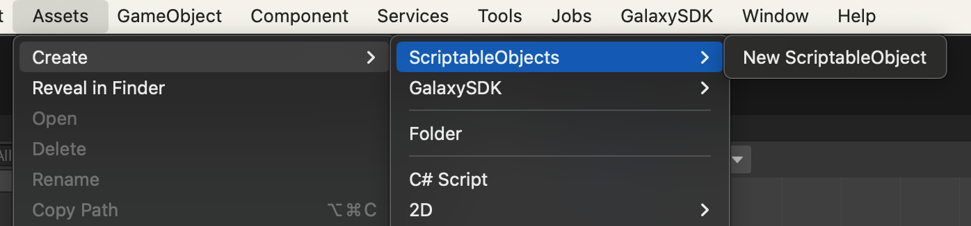 그러면 이렇게 Assets- Create - ScriptableObjects - New ScriptableObject 칸이 생긴걸 보실 수 있는데요 이 기능을 클릭하게 된다면??