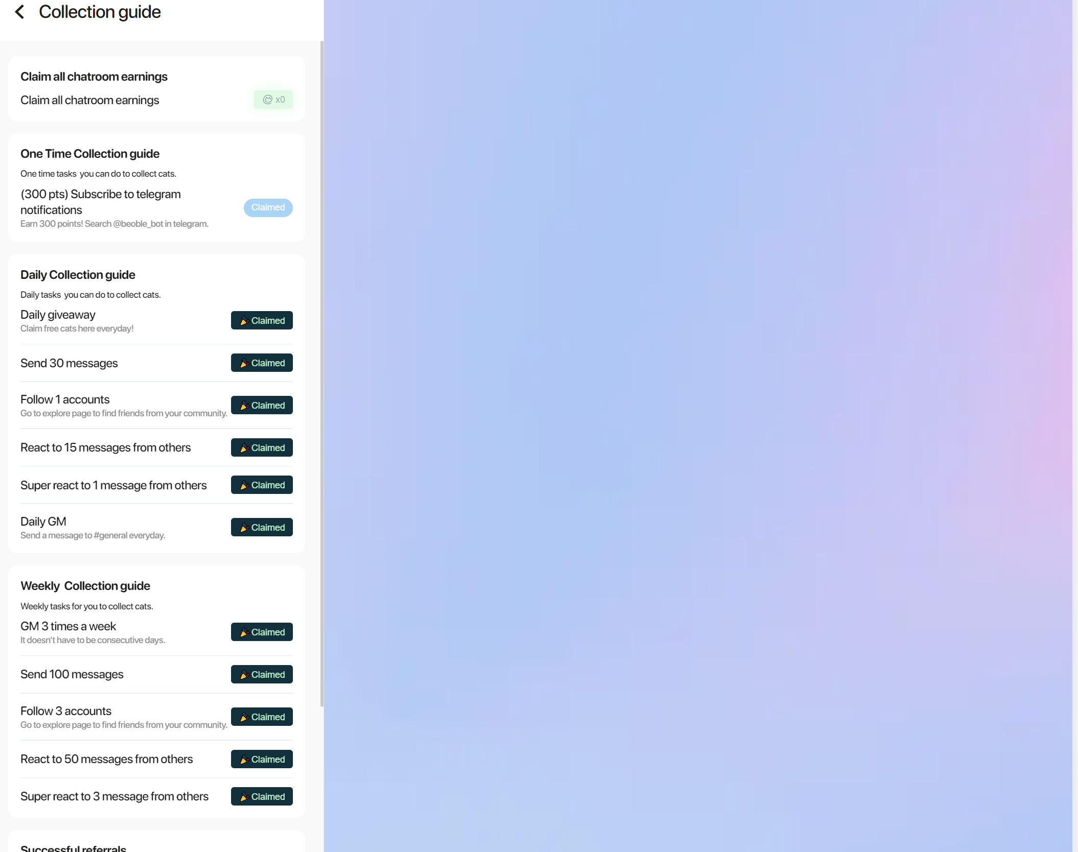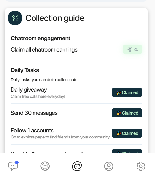 접속하시면 저 밑의 3번째 고양이를 눌러서 퀘스트 항목에 맞게 참여하시고 클레임 누르시면 됩니다~