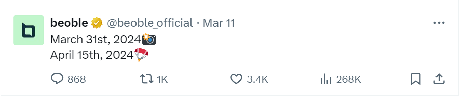 스냅샷은 3월 31일 에어드랍은 4월 15일을 암시하는 트윗을 남겼습니다.
