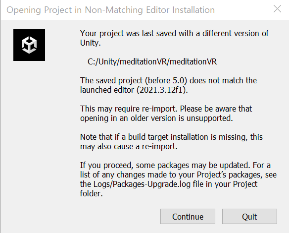 💻 Programming (프로그래밍)/Unity | C# [Unity] 버그 오류 opening project in non-matching editor installation - <마지막에 저장된 프로젝트와 현재 열려는 에디터의 버전이 서로 일치하지않을때 생기는 버그> Continue를 누르면 일부패키지가 업데이트가 될 수 있어 , 진행중인 프로젝트 였다면 충돌이 날 수 있다. 문제상황 : 에디터 23.3.12.f1버전으로 3D URP 프로젝트를 새롭게 만들었다가 뜸 해결방안 : Continue를 눌렀더니 잘 해결됐다 공유하기 게시글 관리 천리길도 한걸음씩 저작자표시 (새창열림) '💻 Programming (프로그래밍) > Unity | C#' 카테고리의 다른 글 [UNITY] ECS (Entity Component System) 기본 튜토리얼 (1) 2023.12.07 [Unity][C#][Design Pattern] Strategy pattern - 전략 패턴 (1) 2023.10.13 [Unity][C#][Design pattern] Singleton 기법을 더욱 편리하게 (1) 2023.10.11 [Unity] 새롭게 개정되는 유니티의 가격 정책, 런타임 요금제(0923수정) (0) 2023.09.19 [Unity] 스크립터블 오브젝트(Scriptable Object)로 데이터 저장, 읽기를 손쉽게! (0) 2023.09.15 Contents 당신이 좋아할만한 콘텐츠 [UNITY] ECS (Entity Component System) 기본 튜토리얼 2023.12.07 [Unity][C#][Design Pattern] Strategy pattern - 전략 패턴 2023.10.13 [Unity][C#][Design pattern] Singleton 기법을 더욱 편리하게 2023.10.11 [Unity] 새롭게 개정되는 유니티의 가격 정책, 런타임 요금제(0923수정) 2023.09.19 댓글 0 + 이전 댓글 더보기
