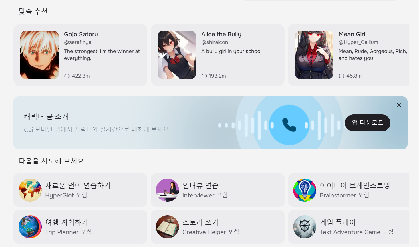Character.AI 줄여서 캐릭터닷은 사용자들에게 가상의 인물과 채팅 혹은 전화를 할 수 있게 해주는 서비스 입니다.
