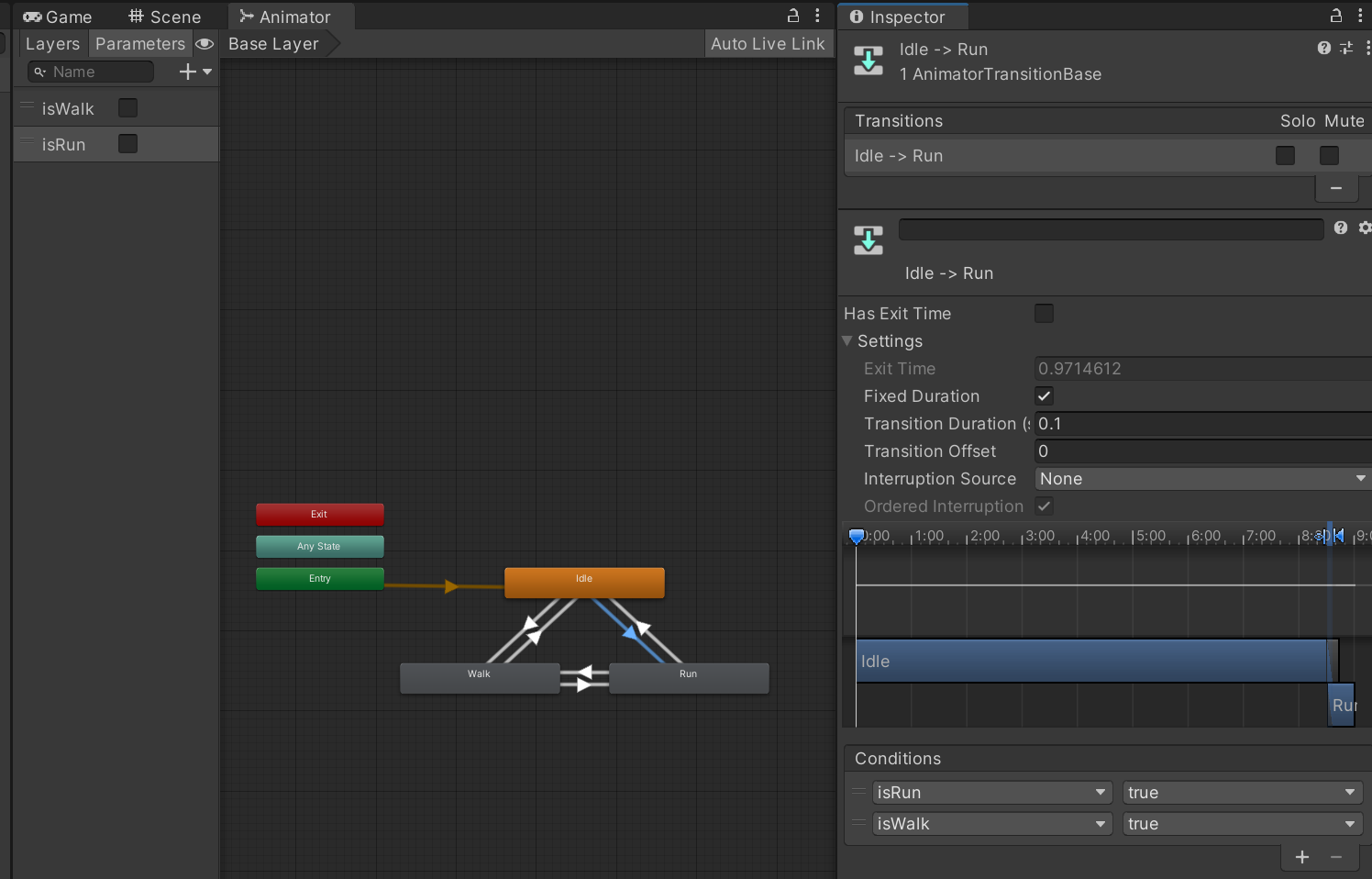 animator의 isWalk, isRun 입력 조건을 설정해줍시다.