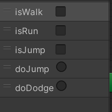 - 또한 점프 회피는 신호가 들어오면 모션을 실행하는 trigger로 parameter을 만들었고, 점프상황을 알리는 bool변수로 isJump를 추가하였습니다