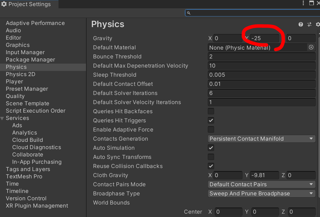 Edit - Project Settings - Physics 에 Gravity를 높혀 점프 시 더 낮게 뛰도록 만들어줍시다.