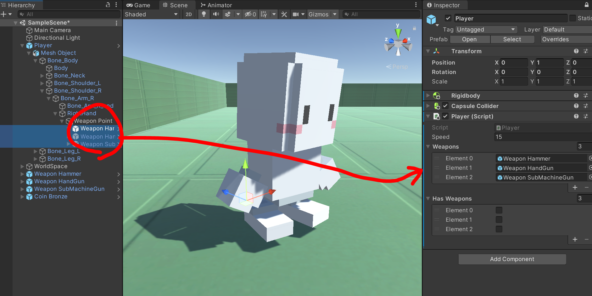 - GameObject들을 담을 weapons 변수를 만든 후, 무기들을 끌어당겨 넣어주었습니다.