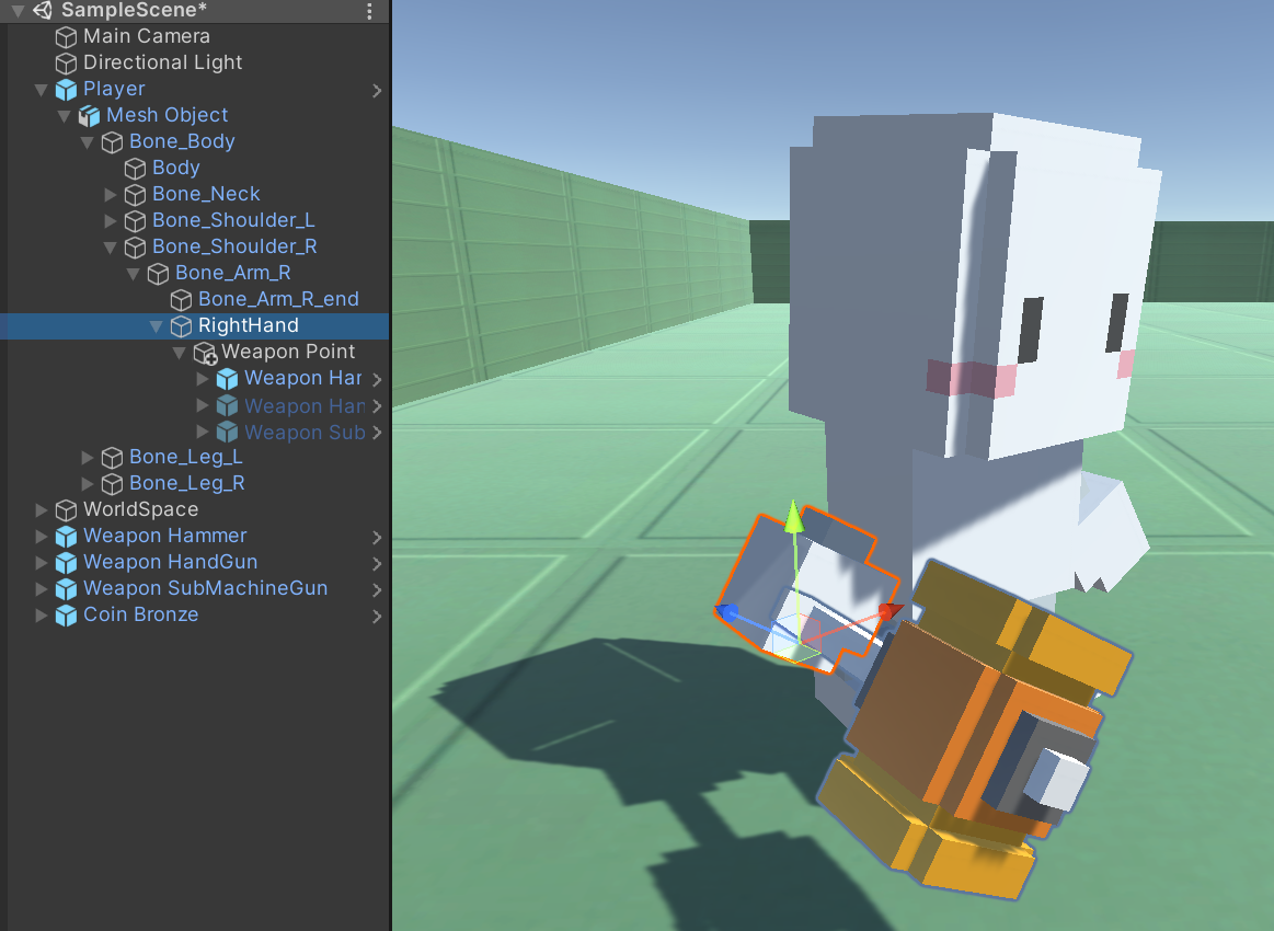 - 플레이어의 RightHand의 하위 오브젝트로 Cylinder을 만들어 Weapon Point로 지정하여 손의 위치에 쥐어줍니다.