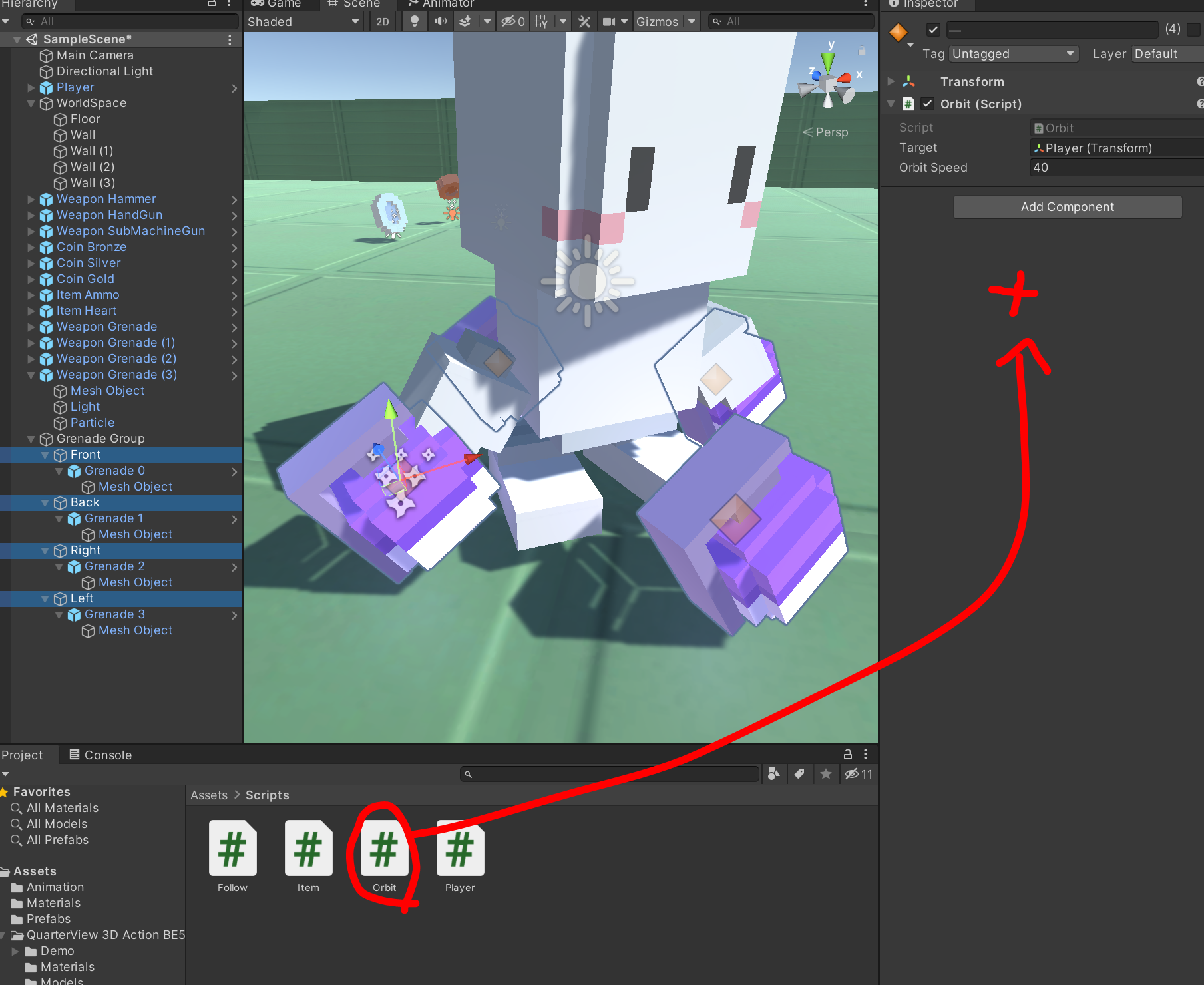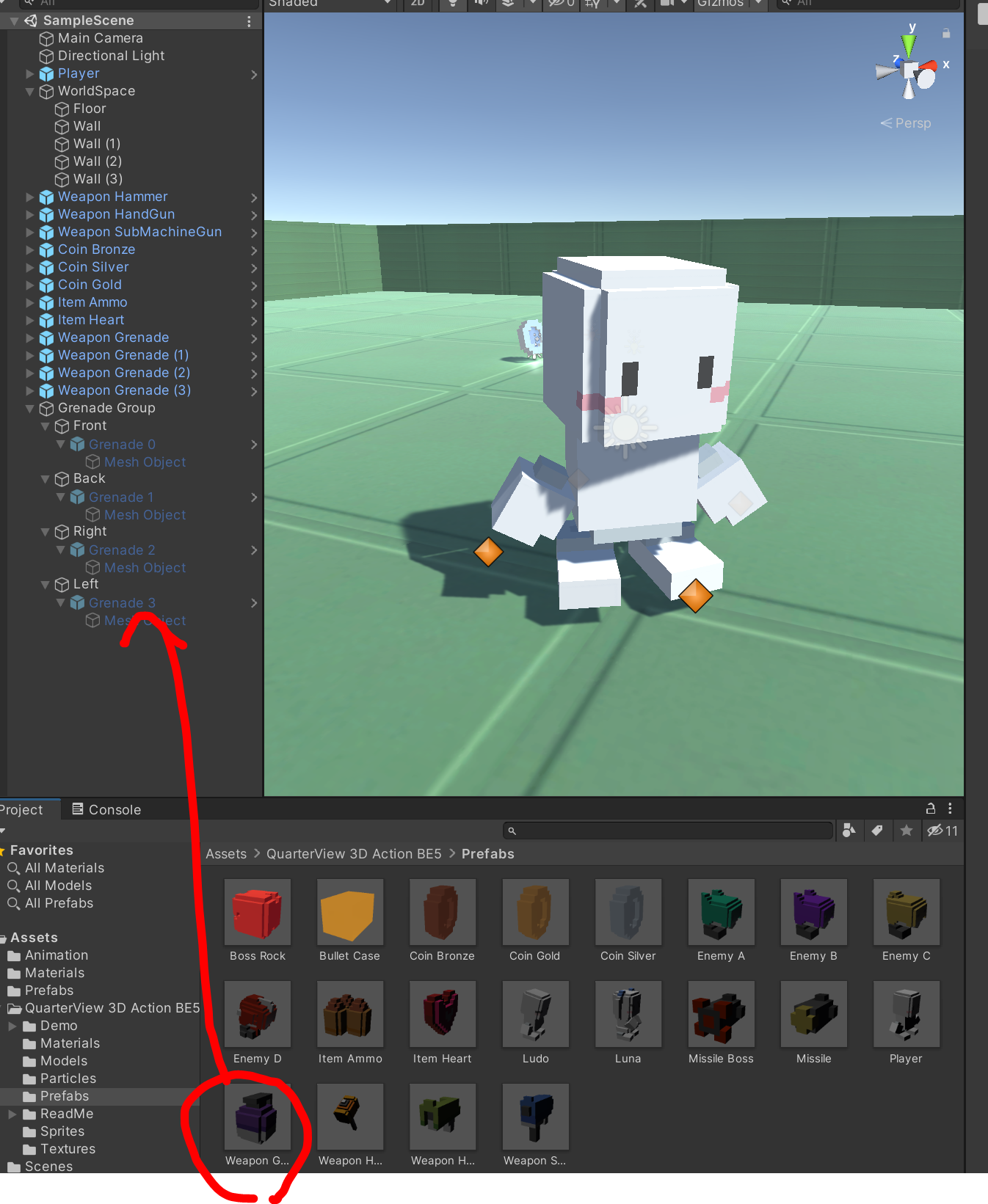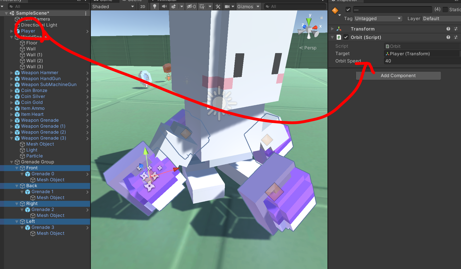 - 공전물체 하위에 수류탄 에셋 넣어주기