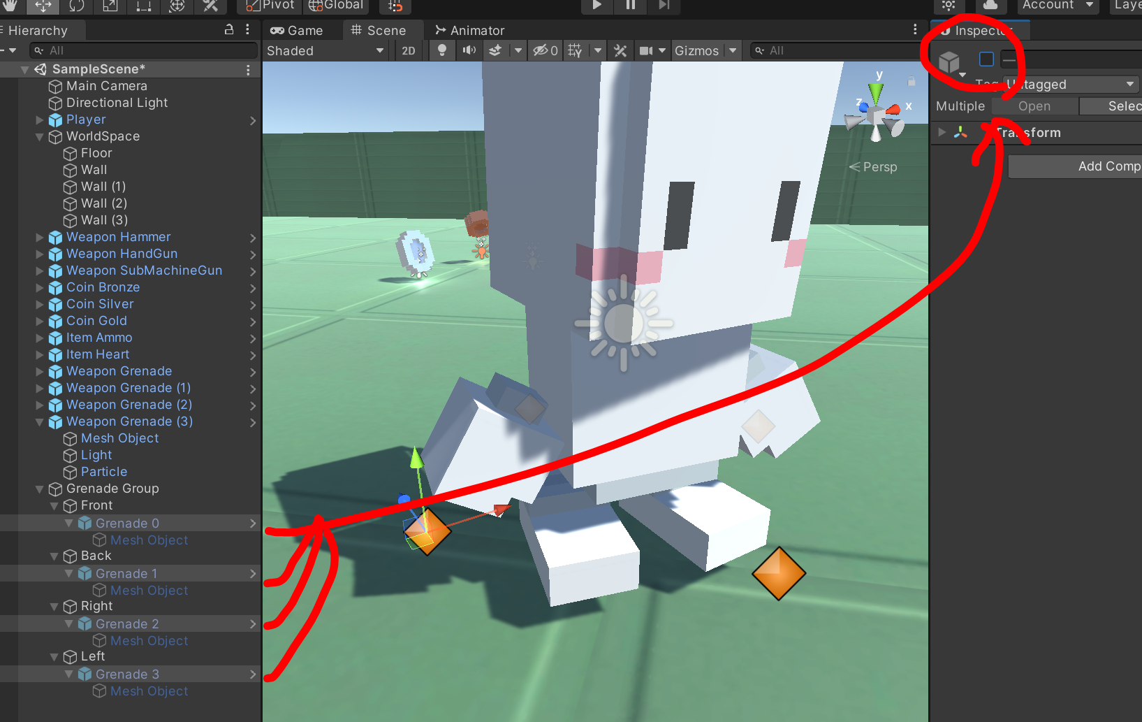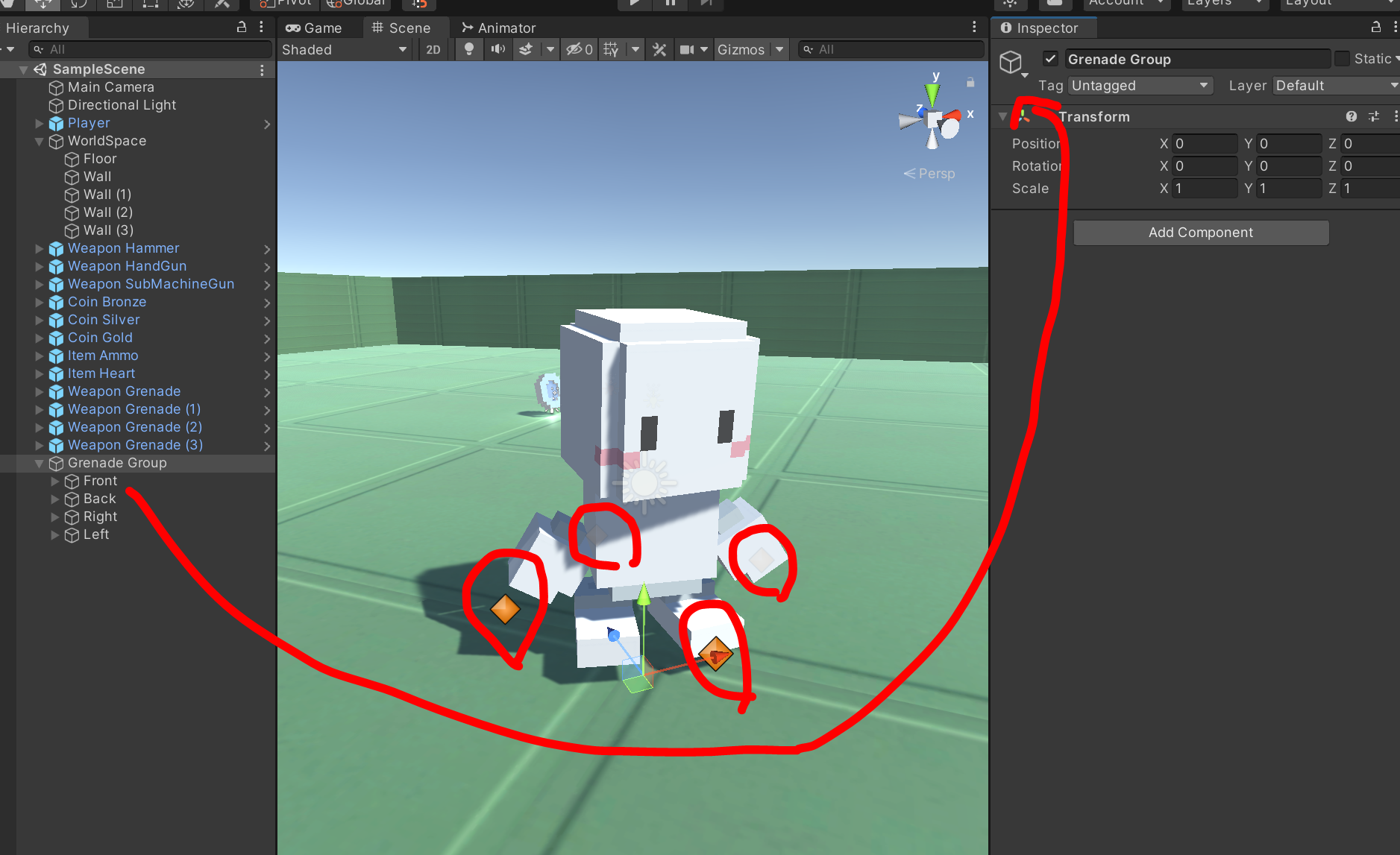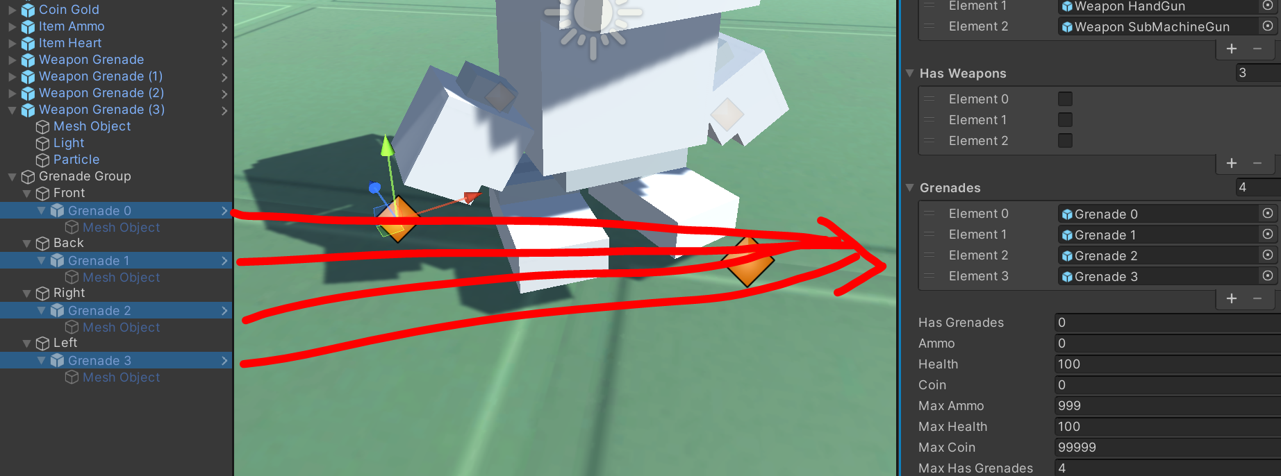 grenades[hasGrenades].SetActive(true); 추가하여, 먹을 시 활성화되어 우리 눈에 보이도록 해줍니다.