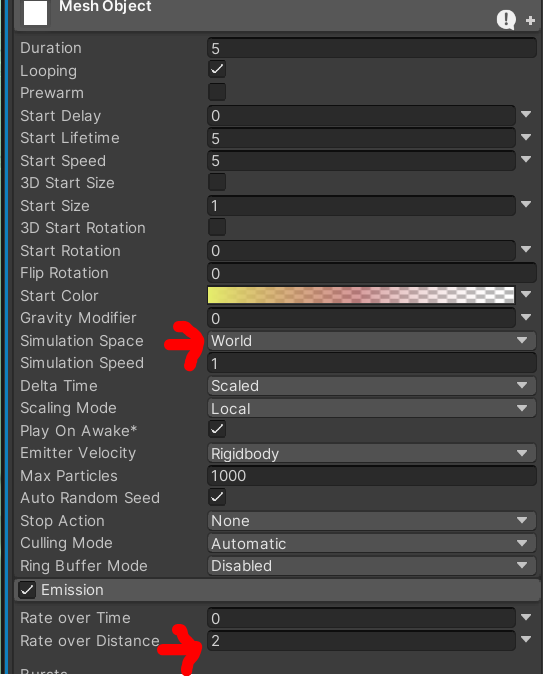 - 파티클 구현에서 Simulation Space 를 local에서 World로 바꿔줍니다