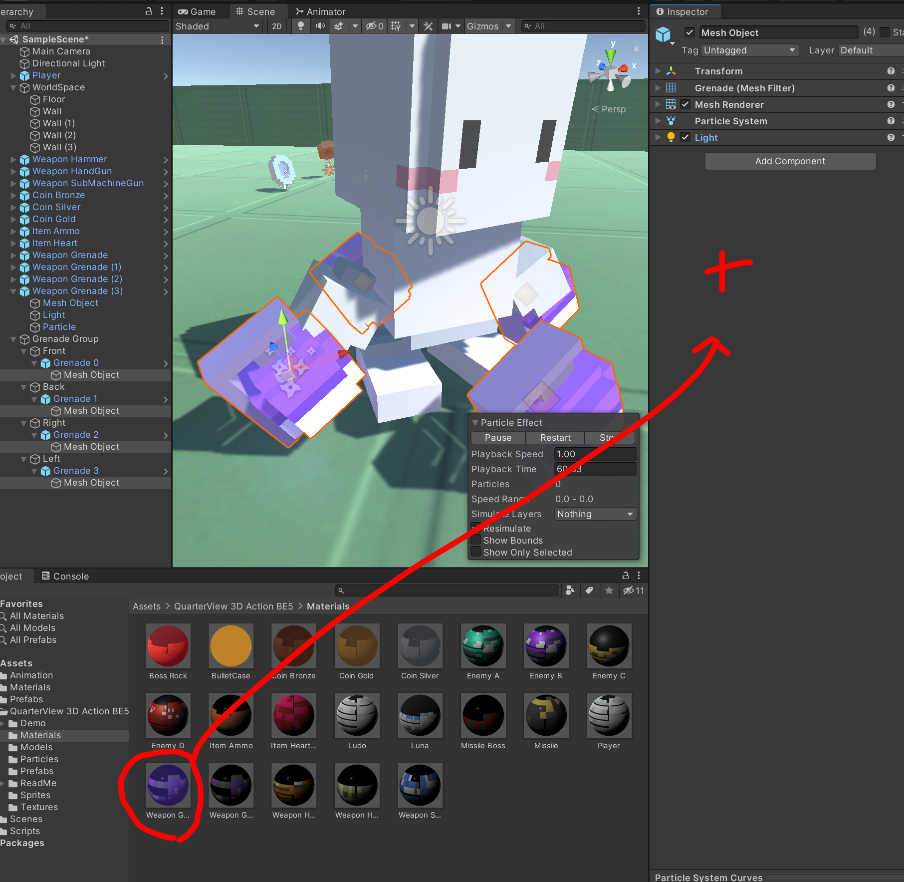 - 수류탄을 꾸미기 위해 재질도 바꿔주고 Light, Particle도 넣어주었습니다.