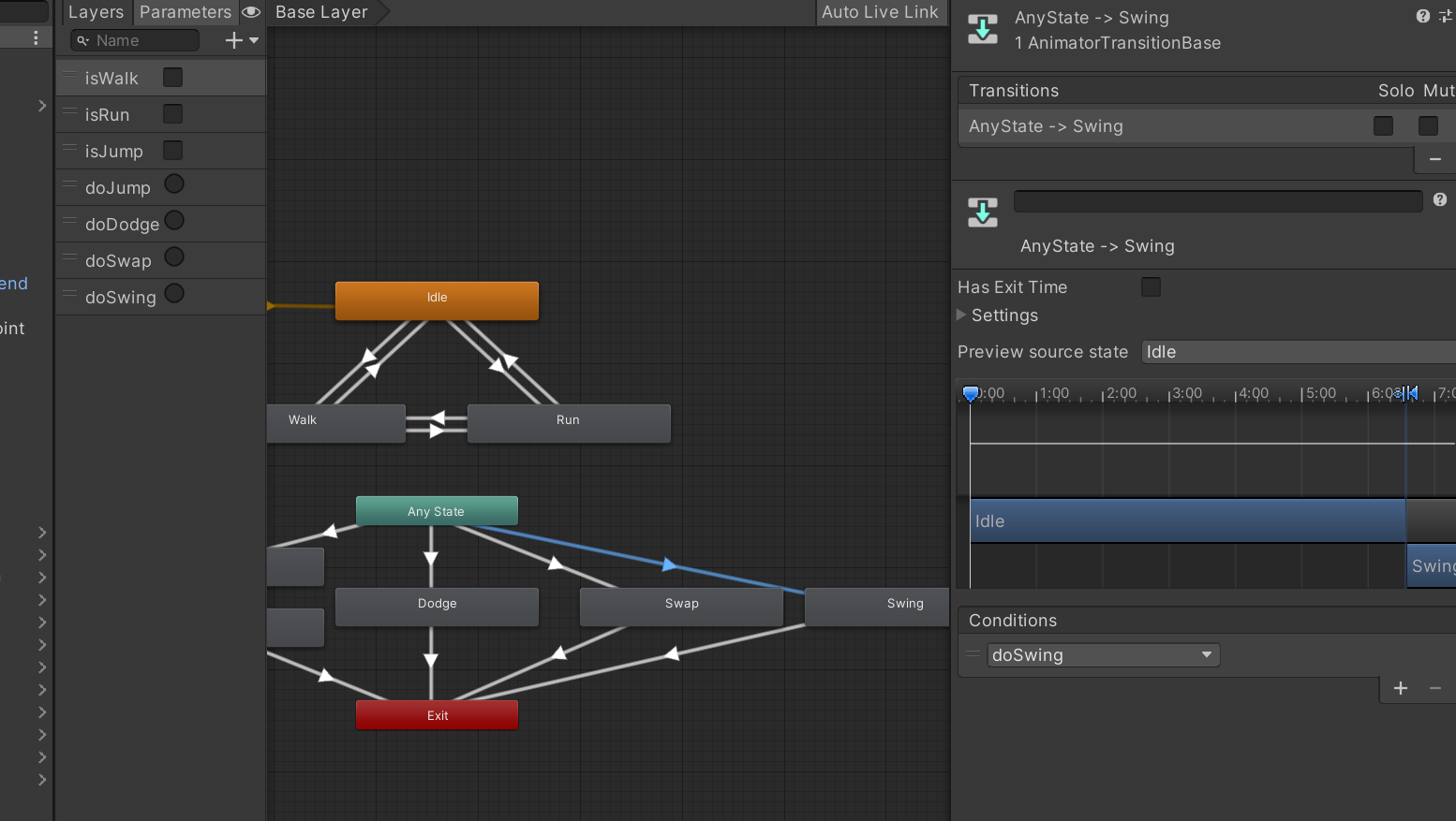 - 스윙 애니메이션을 넣어, doSwing이란 트리거도 만들어줍시다.