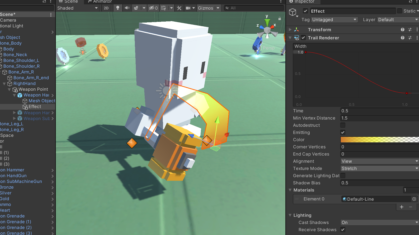 - Trail Renderer을 이용해 움직일때 따라오는 이펙트를 만들어줍시다.
