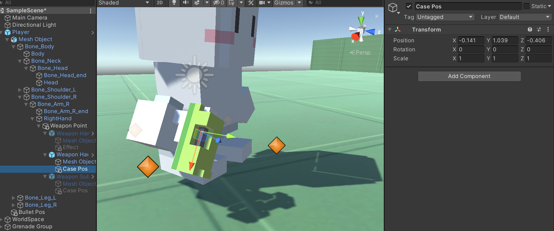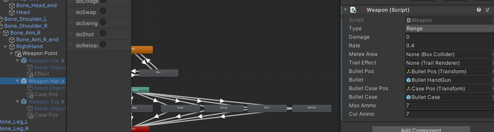 - 스크립트가 완성 되었으니, 플레이어가 오른손에 들고있는 총들의 Weapon 스크립트 값에 Bullet, Bullet Pos, Bullet Case Pos, Bullet Case 오브젝트를 연결시켜 주었습니다.