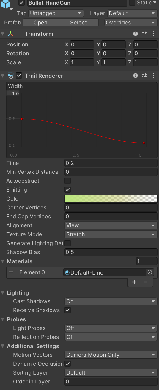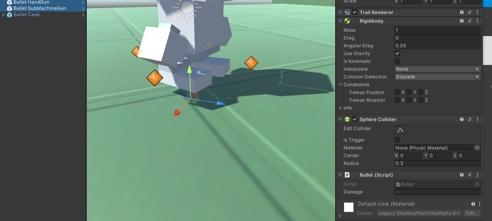 - 이후에 Rigidbody, Collider을 총알들, 탄창에 맞게 넣어줍니다 또한 각 총알들에게만 Trail Renderer을 넣어 총알이 나갈 때 효과를 주었습니다.