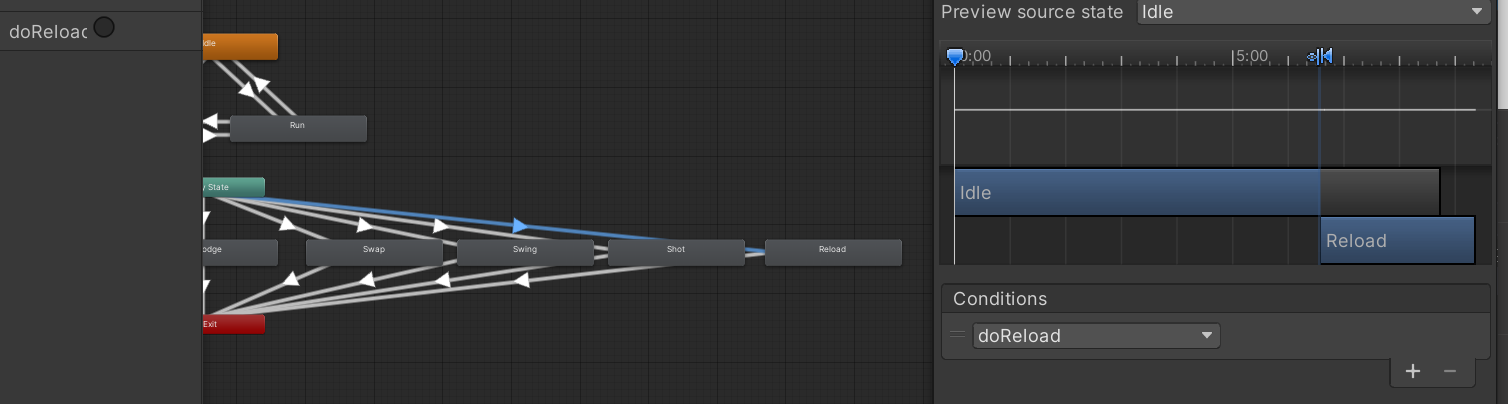 - 애니메이션 컨트롤러에서 doReload트리거를 만들고 모션을 추가하여 연결시켜 주었습니다.
