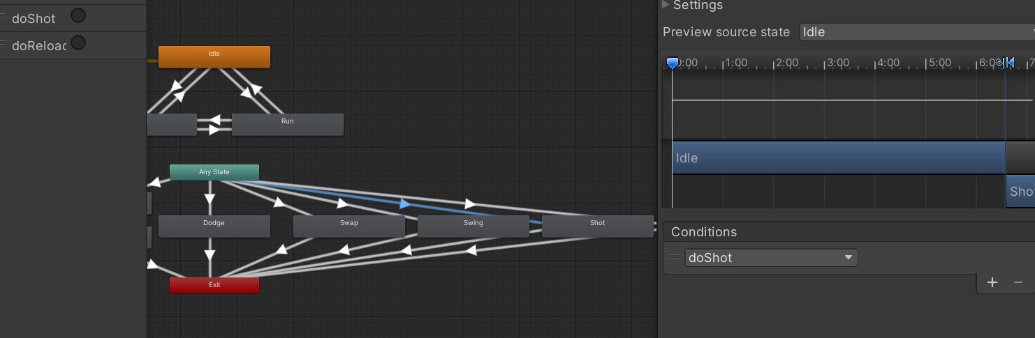 - 애니메이션 컨트롤러에서도, doShot 트리거와 함께 에셋에서 Shot 모션도 넣어 설정해줍니다.