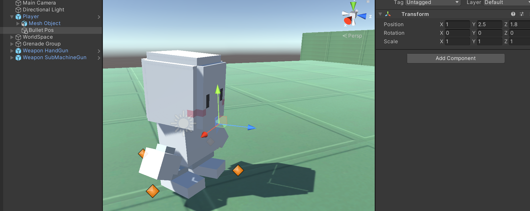 - 총알이 나가는 위치를 잡기위해 Player아래에 Empty를 만든 후 위치를 잡아줍니다.