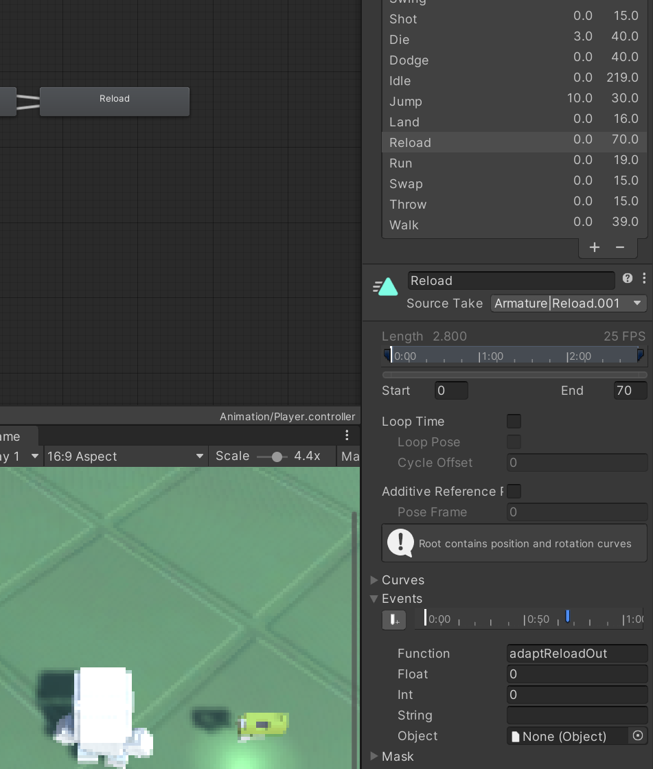 Reload 애니메이션의 어느 지점을 지날 때, adaptReloadOut이라는 함수가 실행 되도록 하였습니다.
