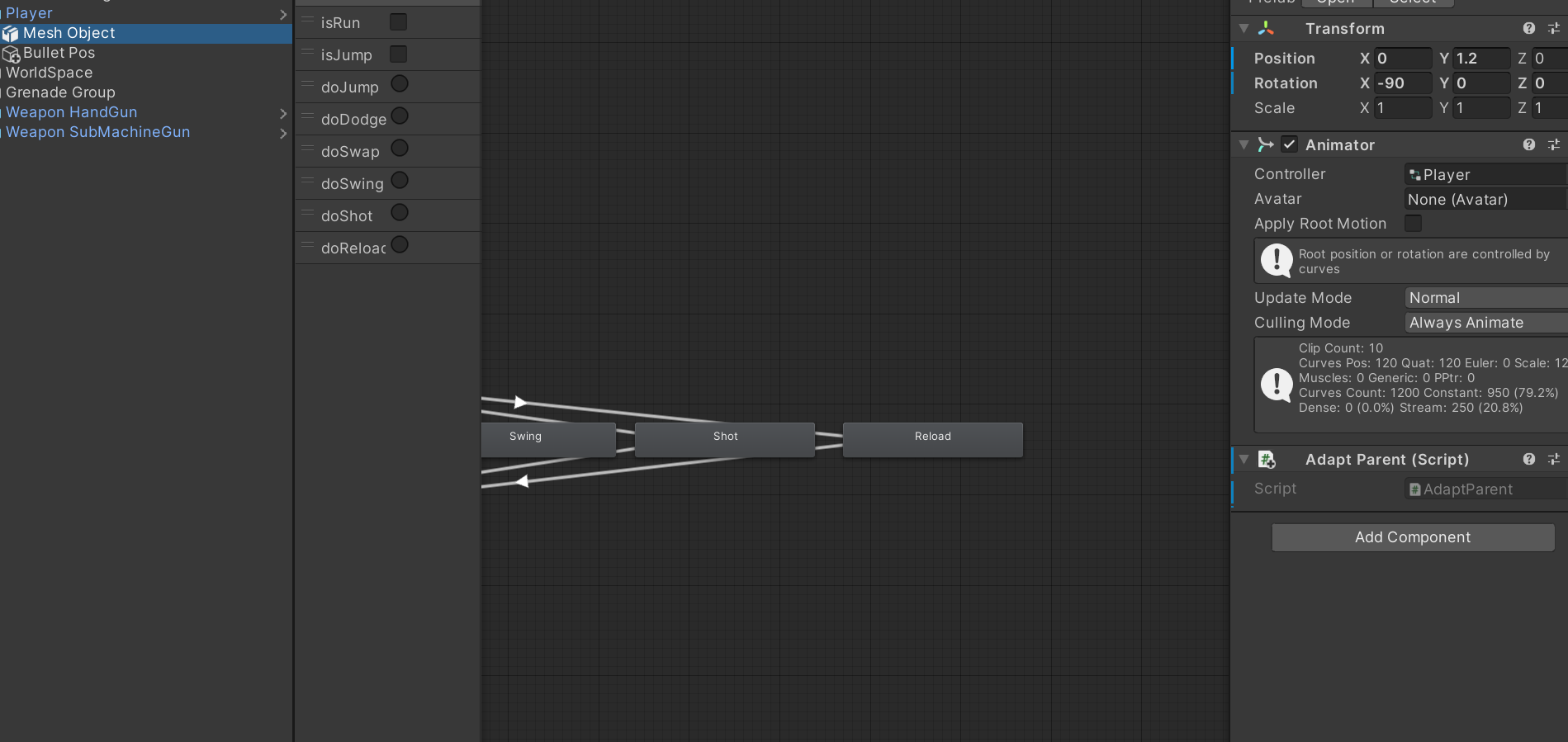 Player 속 Mesh Object에 "AdaptParent" 라는 스크립트를 새로 만들어 넣어줍니다.