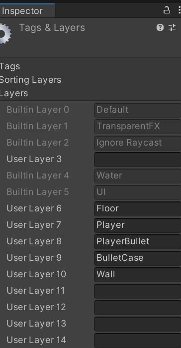 우선 오브젝트의 Layer 에 Player, PlayerBullet, BulletCase, Wall을 추가해줍니다.