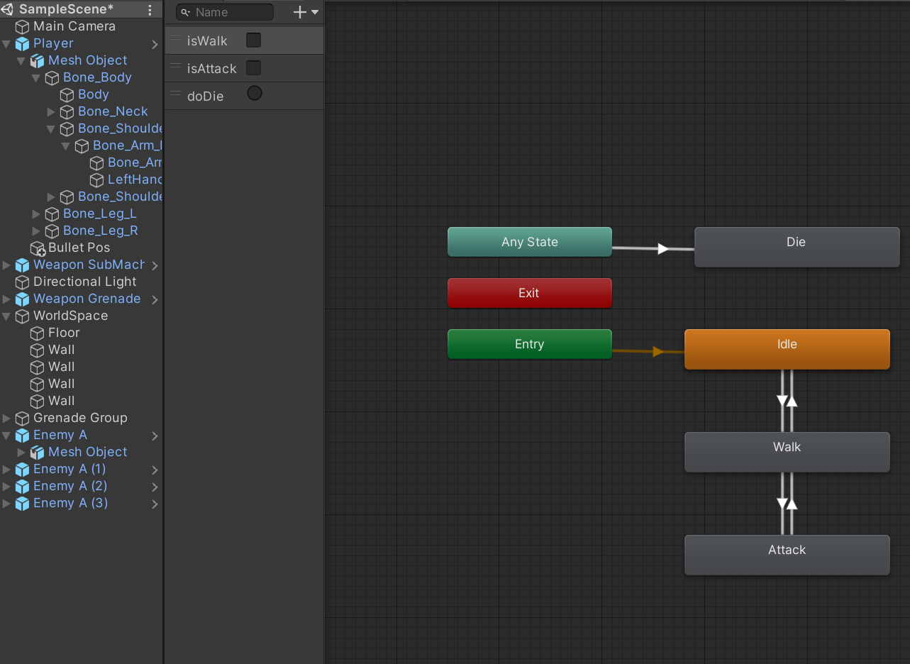 - Attack을 제외한, Walk와 Die State는 각각 쫓을 때, 죽을 때 값을 애니메이션에 넣어줍시다.