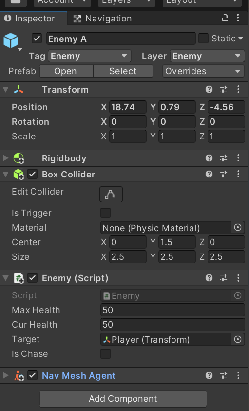 - 이전에 만든 testEnemy처럼, rigidbody, Box Collider, Enemy 스크립트에 이어서 Nav Mesh Agent 컴포넌트 까지 넣어줍시다.