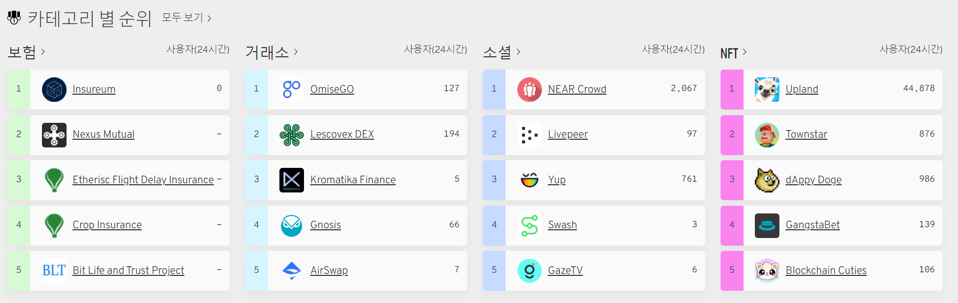 이밖에도 게임, 도박, 금융, 개발, 디파이, 미디어, 지갑, 거버넌스, 보안, 에너지, 의료, 저장소등등 수많은 카테고리의 DApp들이 개발되고 출시되고 있습니다.